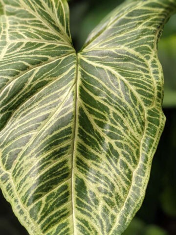 Batik Variegata Arrowhead Plant is a true standout thanks to its incredibly detailed foliage. A striking form of Syngonium podophyllum, it gets its name from the intricate patterns on its leaves that look almost hand-batiked. Each leaf is completely unique. Swirls and streaks of lively green are layered with lime-cream tones, creating a painted, almost artistic effect. The variegation often follows the veins, which appear highlighted and slightly luminous — giving the impression that they glow like neon against the darker green background.