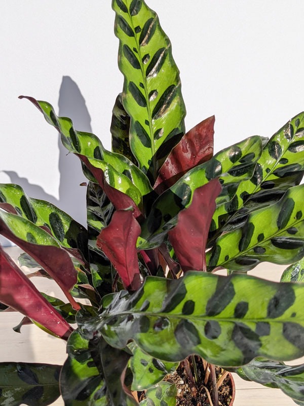 Calathea lancifolia, commonly known as the Rattlesnake Plant, is one of the most visually distinctive foliage plants available. Its long, lance-shaped leaves feature bold deep green markings layered across a lighter green surface, creating a pattern reminiscent of intricate brushwork.