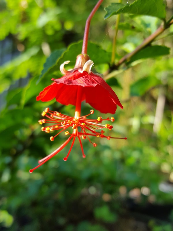Chinese Lantern Hibiscus is truly in a class of its own. The airy, pendant red flowers are unlike any other hibiscus — each bloom features deeply lobed petals that curl dramatically back toward the stem, creating a delicate, almost lacy silhouette. From the center, a long stamen extends nearly two inches, adding even more sculptural flair.