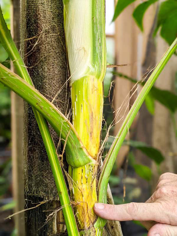 Provided with a pole, totem, or tree to climb, it grows extremely fast and increases significantly in leaf size. Vertical support encourages tighter nodes and larger, more deeply divided foliage. The plant can quickly create a dramatic, tropical canopy effect. Although naturally a climber, it can be maintained in a dense, bushy form through regular pruning. It also adapts well to hanging baskets, where its draping vines soften the bold structure of the leaves. With bright, indirect light and consistent moisture, Giant Aurea Variegated Amazoniconda becomes a fast-establishing, high-impact specimen suited for collectors seeking rapid maturity and strong variegation. Outdoors 10a to 12b