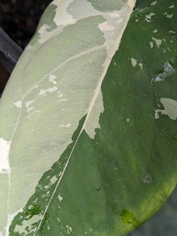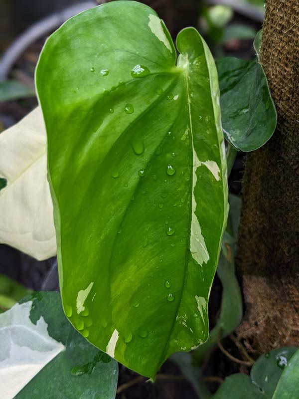 When supported on a pole or trellis, the foliage enlarges dramatically and the plant develops a strong, upright presence. Despite its impressive size potential, it remains wonderfully easy to grow. Bright, indirect light keeps the variegation crisp and vibrant, while regular watering in well-draining soil encourages steady new growth.