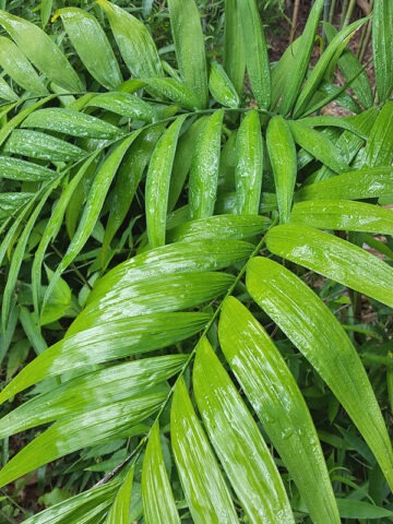 This attractive palm forms dense clumps of slender, bamboo-like stems topped with graceful green fronds. Bright red fruit clusters add seasonal color and ornamental appeal, especially in shaded garden settings.