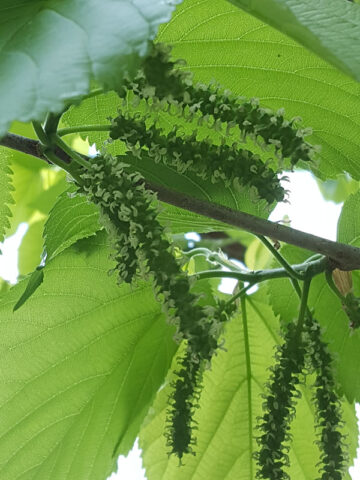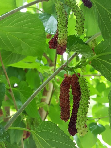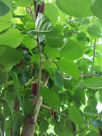 East Coast “Foot Long” Mulberry is an impressive long-fruiting selection of Morus known for its unusually large, deep ruby-red fruit. While not truly a foot long, mature trees can produce berries measuring 4 to 7 inches in length and about 3/8 inch in diameter. The flesh is firmer than many other mulberry cultivars, offering a sweet flavor with a well-balanced finish. Fruit quality is consistently high, making it excellent for fresh eating and preserves. The tree develops a spreading growth habit and features large, heart-shaped leaves that can reach substantial size, giving it strong ornamental presence in addition to fruit production.