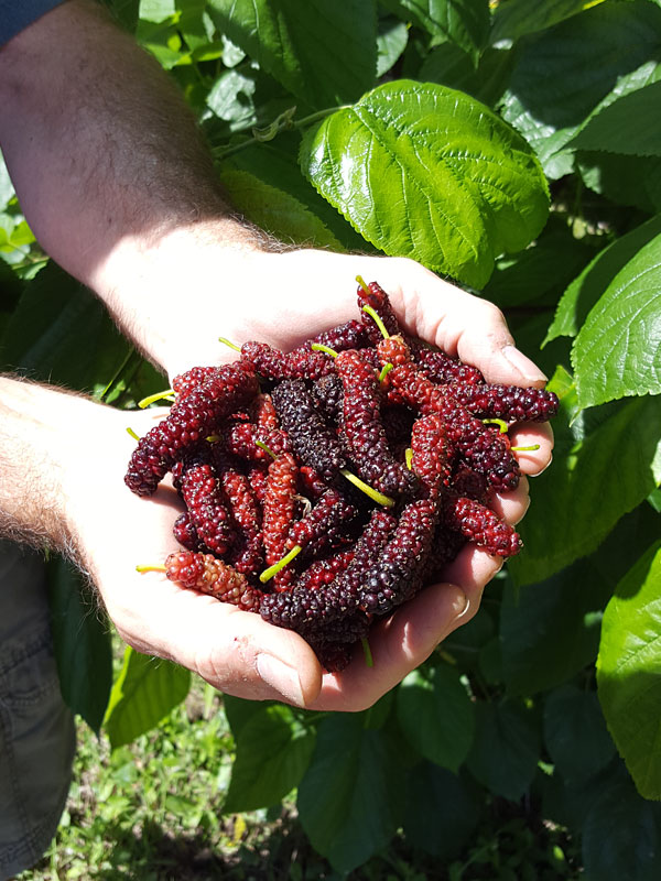 Botanically, mulberries are not true berries but collective fruits. After pollination, the tiny individual flowers swell along with their fleshy bases, merging together into a single elongated fruit. As it ripens, the texture softens and the color deepens, becoming juicy and full-bodied. Best grown in full sun with well-draining soil, East Coast “Foot Long” Mulberry is valued for its oversized fruit, balanced flavor, and vigorous growth. Zones 4-8