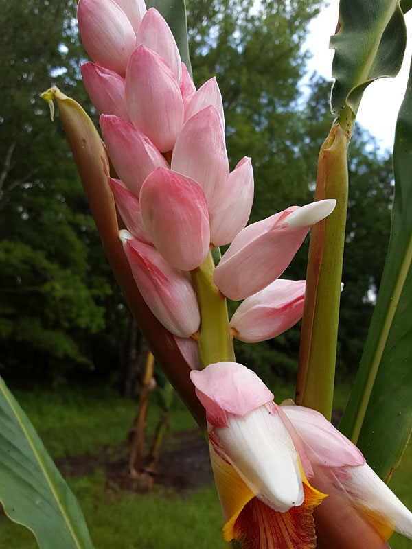Alpinia malaccensis, the Giant Pink Shell Ginger, is truly an absolute giant in the tropical garden. Mature clumps commonly reach 8 to 12 feet tall, and in ideal conditions can grow even taller. A single established stand often produces a dense cluster of 40 or more upright stems, creating a bold, commanding presence.