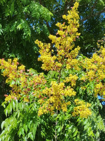 Golden Rain Tree, Koelreuteria paniculata, is a brilliant ornamental known for its glowing display of bright yellow flowers. In spring and summer, large airy panicles cover the canopy in a luminous wash of gold, creating a standout focal point in the landscape.