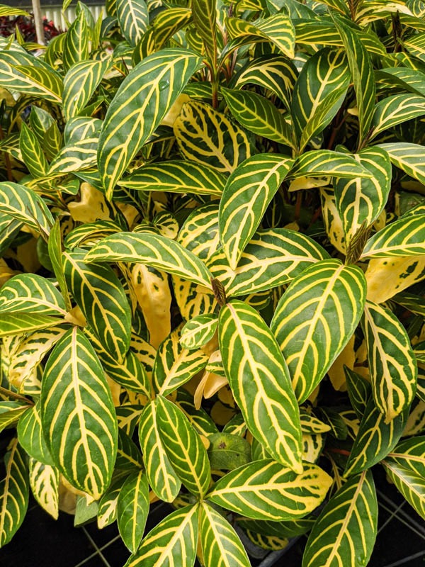 Giant Tropical Shrub (Sanchezia speciosa) is a larger-growing species distinguished by its bold foliage and impressive leaf size. Significantly larger than Sanchezia nobilis, it produces deep green leaves that can reach up to 10 inches long, boldly striped with bright yellow markings.