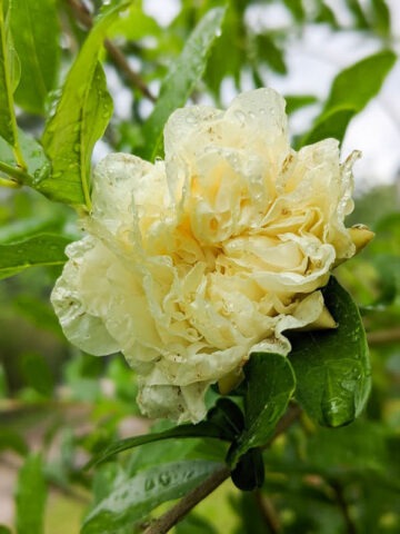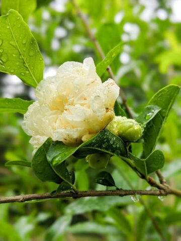 Hawaiian Beauty Pomegranate Tree is a fast-growing and uncommon selection of Punica granatum recognized for its distinctive white blossoms. In spring through summer, ornate white flowers appear along the branches, offering a unique contrast to the more typical red-flowering pomegranate varieties.