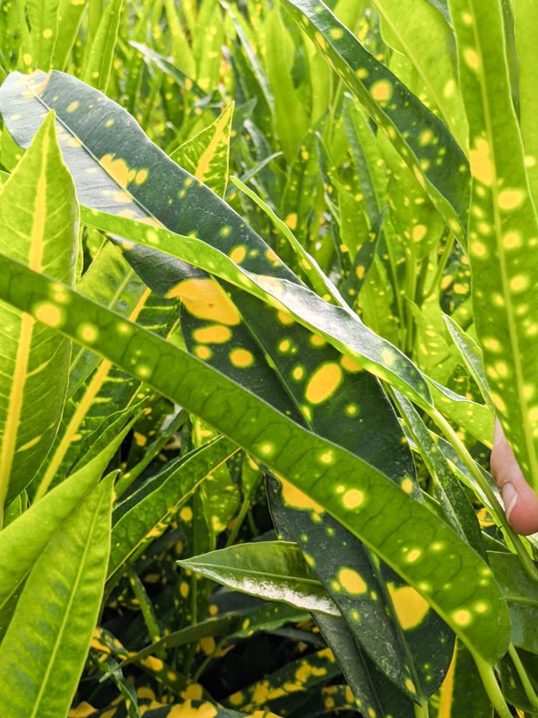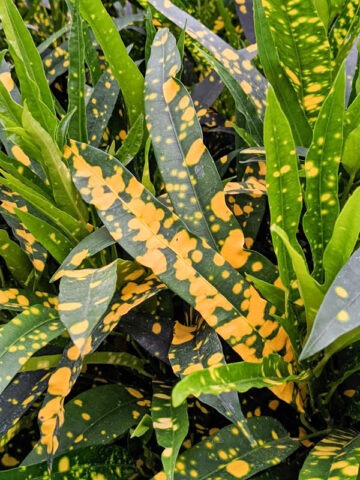 The plant creates a lively, splattered pattern that stands out among traditional croton selections. When placed near a bright, sunny window or incorporated into the landscape in suitable climates, the foliage color intensifies and develops its strongest contrast.