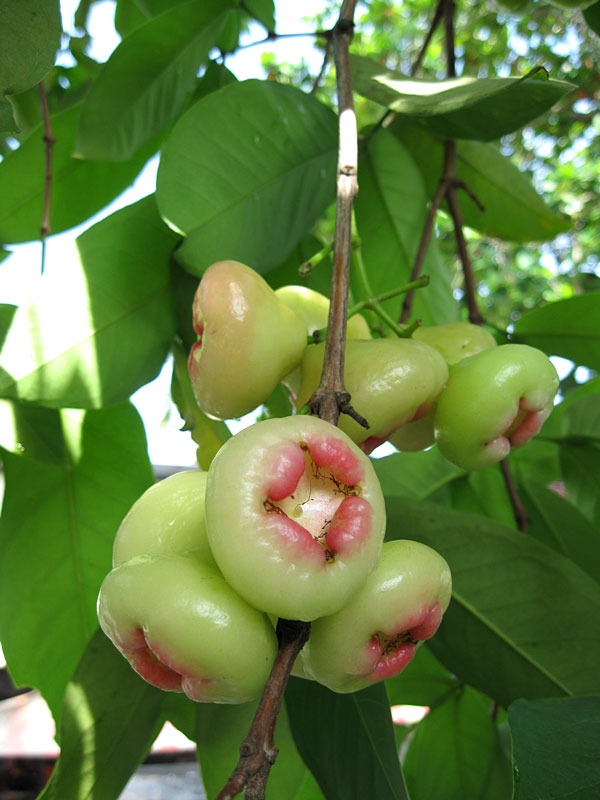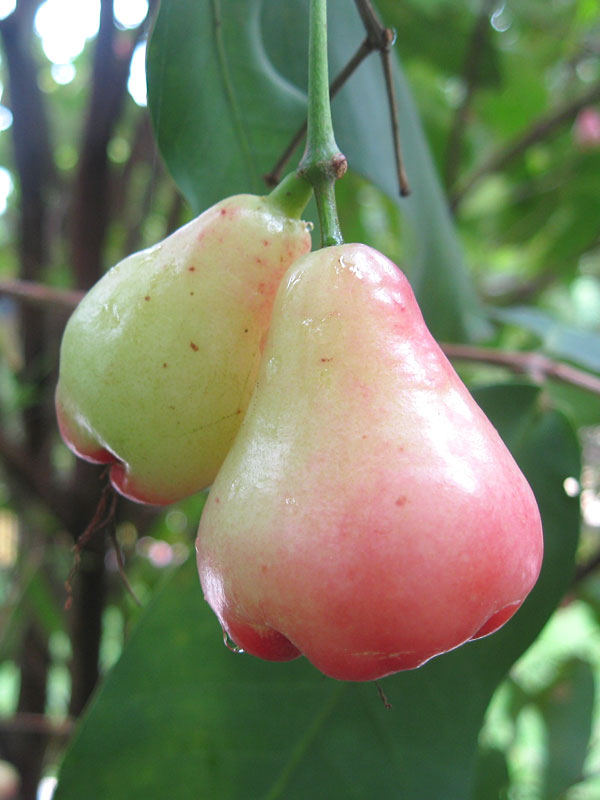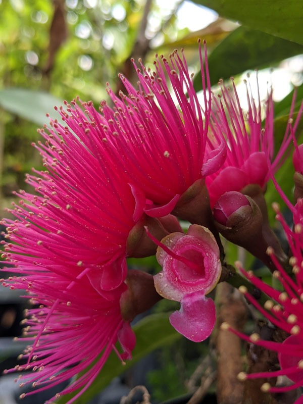 Malay Apple Tree, Syzygium malaccense, is a fast-growing tropical fruit tree prized for its striking fruit and lush foliage. Though the showy flowers are often hidden within the canopy, they create a beautiful effect when they fall, forming a colorful carpet beneath the tree.