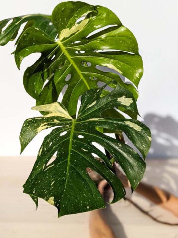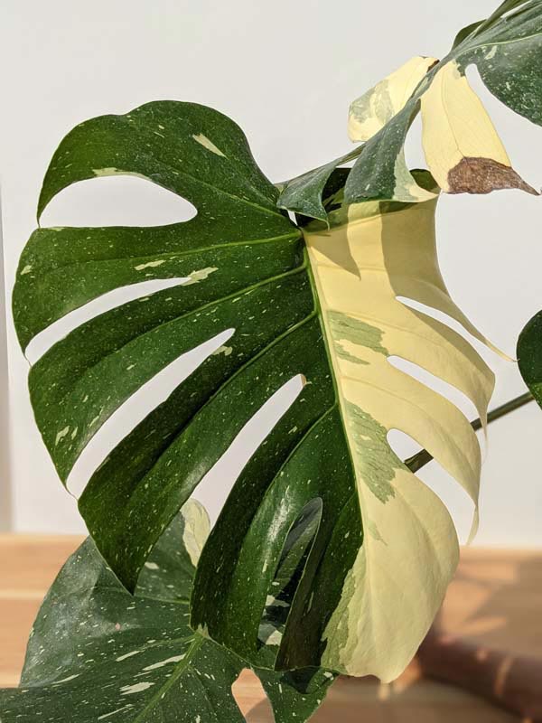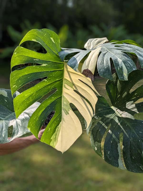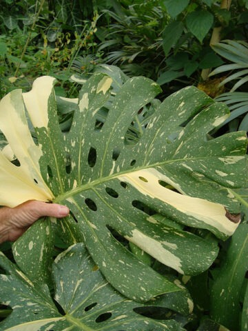 This variety grows two to three times larger than Borsigiana Albo types, with vines capable of reaching one inch in diameter and foliage expanding to an astonishing 3.5 feet long by 3.5 feet wide. The leathery leaves display bold green and cream variegation with dramatic splits and perforations. Variegation intensity may vary from leaf to leaf, yet it remains remarkably consistent, we have grown this plant for over 30 years and have never observed a solid green reversion, making it an exceptionally stable variegation form.