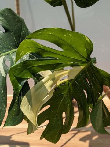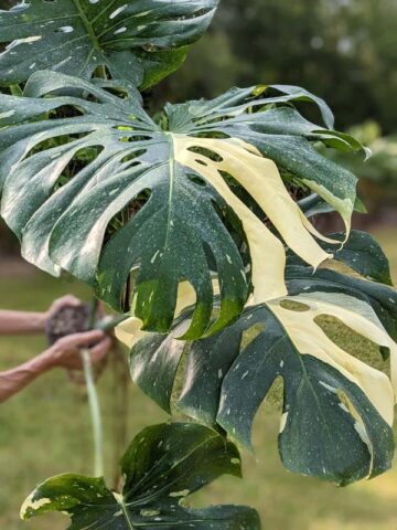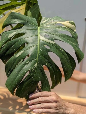 Monstera Deliciosa ‘Banana Split’ is an absolutely enormous, fast-growing variegated form built to fill serious space, indoors or out. The massive cutting shown in the gallery came from a plant only 1.5 years old, grown on a pole in our mother house, demonstrating just how vigorous this selection can be. It is exceptionally tough, highly tolerant of neglect, and ideal for anchoring a large area in a tropical collection.