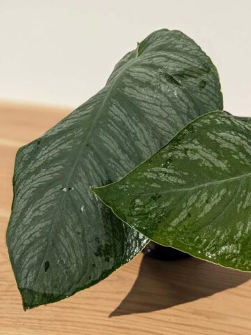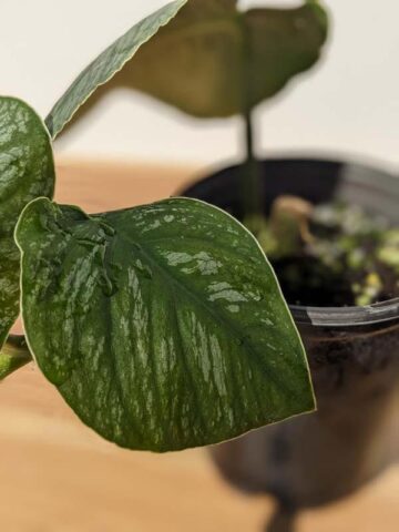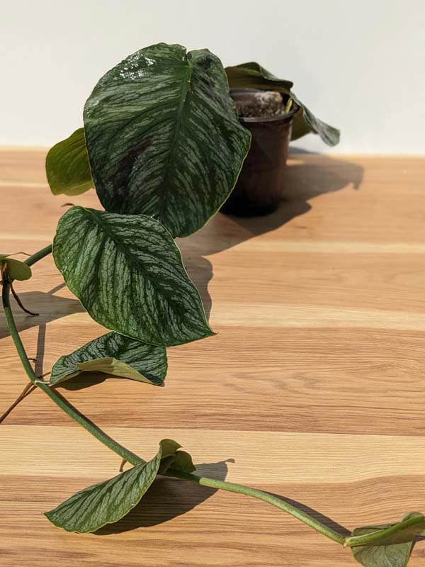 In its juvenile stage, each leaf displays soft silver variegation layered over deep green, giving the plant a luminous, textured finish. The tight shingling habit makes it especially captivating when grown on a wooden plank or moss pole, where it clings closely and creates a sculptural, dimensional display.