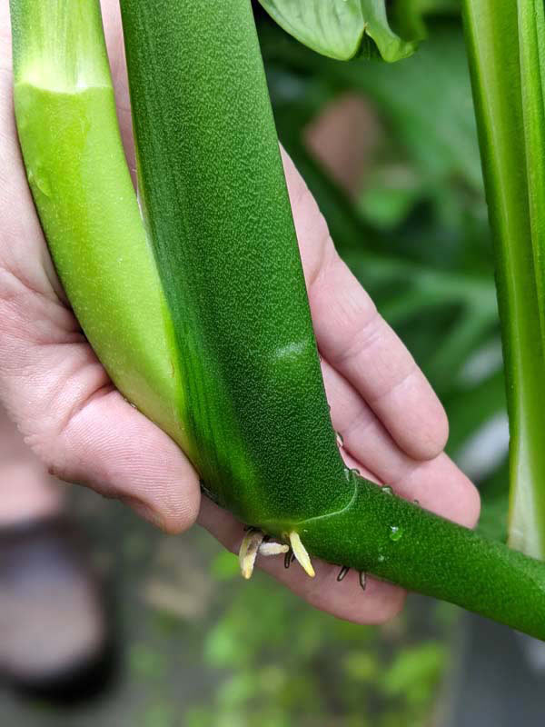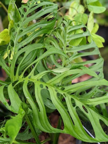 Immensely large leaves emerge upright from the mature stem, each one expanding with bold structure and heavy substance. As the plant climbs and gains strength, the fenestrations become more exaggerated and abundant. Enormous Swiss-cheese-like perforations open throughout the entire blade, transforming the leaf into what appears to be the skeletal embodiment of the tropics. The result is airy yet massive — architectural yet wild.