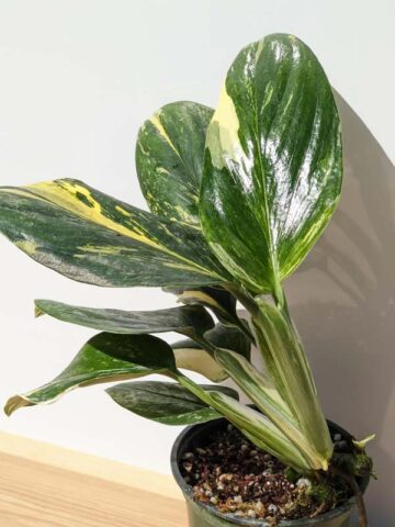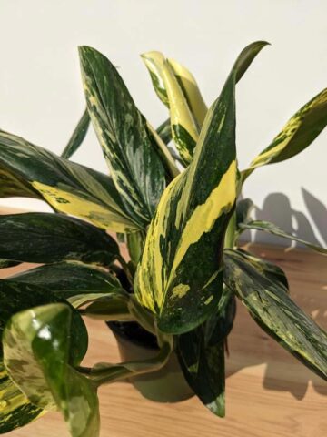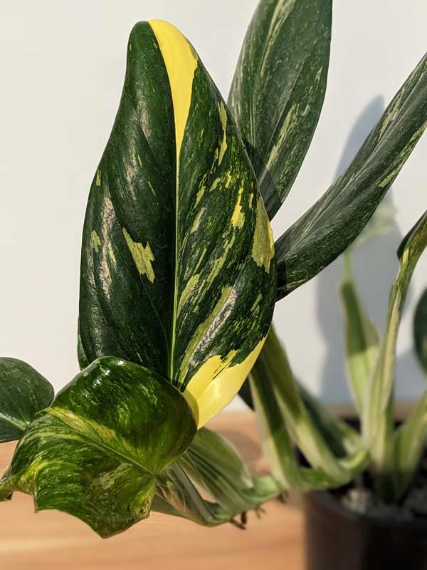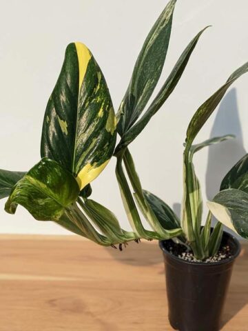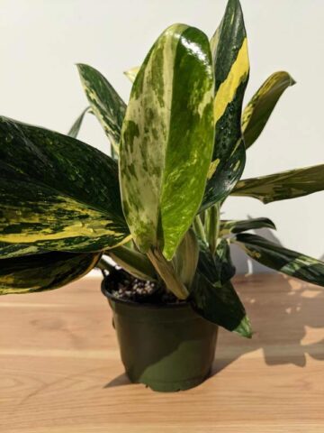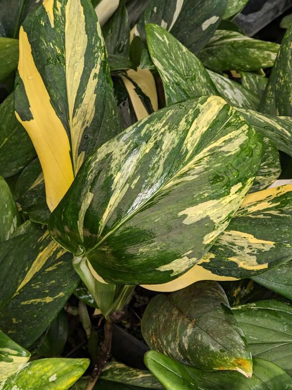 Monstera standleyana ‘Aura’ is a standout favorite at the nursery, admired for its vivid yellow and silvery gray variegation that appears consistently across the foliage. The bright coloration gives the plant a lively, high-contrast look while still maintaining strong green structure beneath.