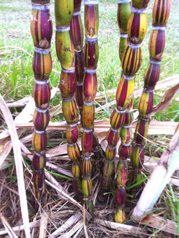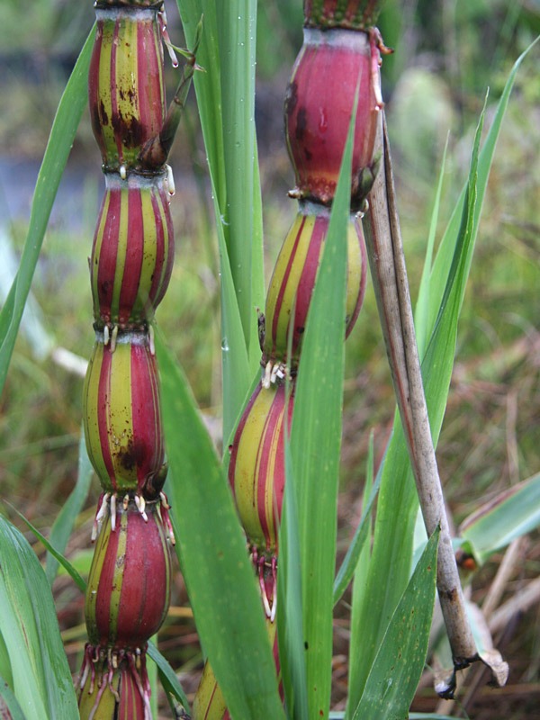 Hilo Buddha Hawaiian Sugarcane is one of the most sought-after ornamental sugarcane varieties, prized for its dramatic structure and exceptional sweetness. The thick, rounded, balloon-like nodes give the stalks a sculptural appearance that instantly sets this selection apart. Subtle shifts of green, gold, and blush tones develop along the canes as they mature, creating a striking vertical feature in tropical gardens and large patio containers.