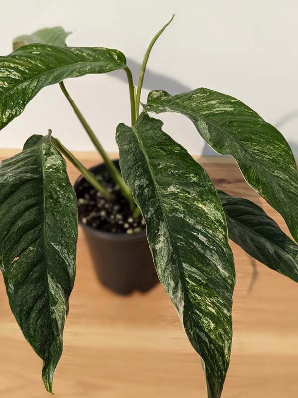 Strong aerial roots anchor the plant securely as it ascends, reinforcing steady upward growth and maintaining an organized indoor framework. The leaf shape remains balanced and proportioned, allowing the variegation to stand out cleanly against the green base. Thriving in bright, indirect light with consistent moisture and well-draining soil, Rhaphidophora megasperma ‘Variegata’ delivers bold foliage contrast and dependable climbing performance for interior tropical settings.