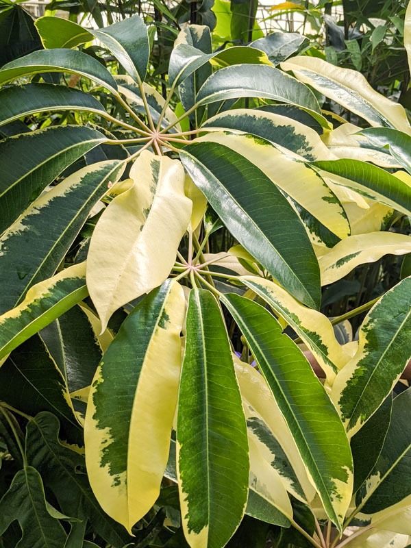 In summer, unusual small mallet-shaped flowers emerge directly from the trunk, offering an interesting display without the heavy bee activity or messy drop often associated with standard Schefflera varieties. Leaves grow in clusters of five to seven at the ends of long stems, forming the familiar umbrella-like pattern. Thriving in bright light with well-drained soil and consistent moisture, this rare variegated selection performs best in USDA Zones 10 to 11.