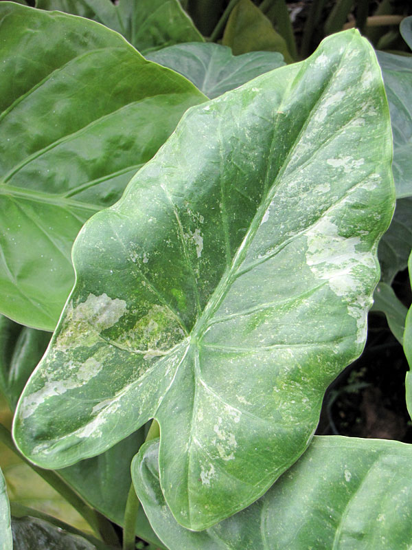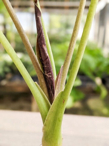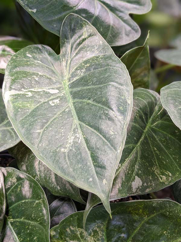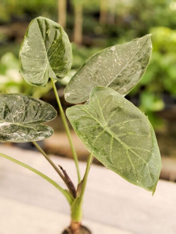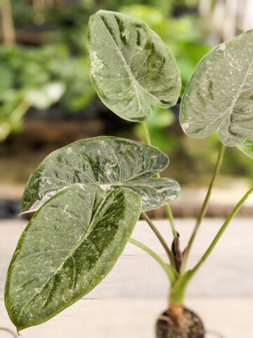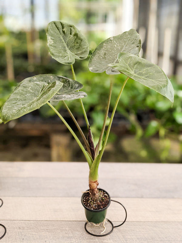 RARE Wentii Kaleidoscope is a striking variegated selection featuring beautiful cream and silver markings across bold, shield-shaped foliage. This fast-growing variety makes an immediate statement, combining dramatic color with impressive size. Its large, blistered leaves regularly reach up to 36 inches long—and can exceed that under ideal growing conditions. At our nursery, these vigorous plants thrive in rich compost, growing up to 4 feet tall with leaves spanning nearly 3 feet across.