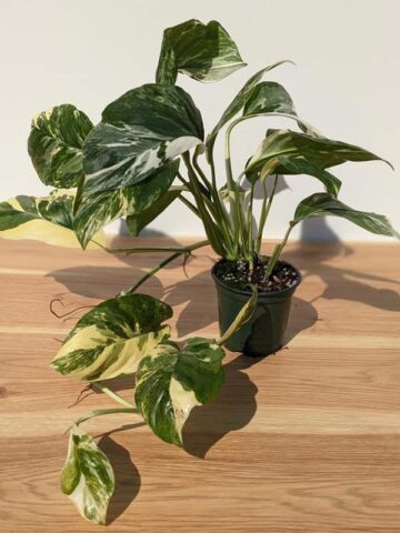 Monstera lechleriana ‘Albo Variegata’ is a striking variegated form of Monstera lechleriana admired for its highly patterned foliage and vigorous climbing habit. The oblong leaves are textured and slightly leathery, providing a firm surface that showcases the dramatic variegation. Splashes, streaks, speckles, and swirls of white, cream, soft grey, and multiple shades of green blend across each blade in unique combinations. No two leaves are alike, and the layered coloration gives the plant continuous visual interest. Long petioles hold the foliage outward from the main stem, creating an open, architectural presentation. The petioles often display similar flecking or marbling, adding to the cohesive look. Mature leaves can reach approximately 12 inches in length, especially when the plant is allowed to climb.