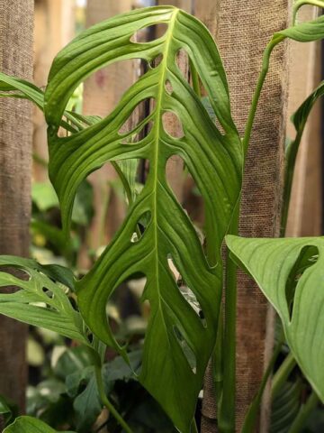 Monstera ‘Pachicutza’ is a robust, fast-growing climbing selection known for its bold, divided foliage and strong upward growth. Originally acquired at a specialty plant auction in Miami, this cultivar quickly proved itself as a vigorous and adaptable performer. The leaves display a split pattern reminiscent of obliqua types, yet with a thicker, more substantial feel.