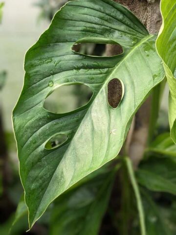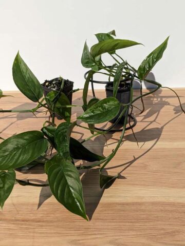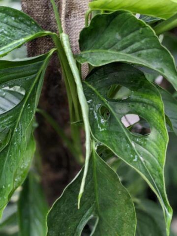In its juvenile stage, short petioles hold the leaves closer to the stem, giving the plant a full, layered appearance. This compact presentation gradually transforms as the plant climbs and matures.