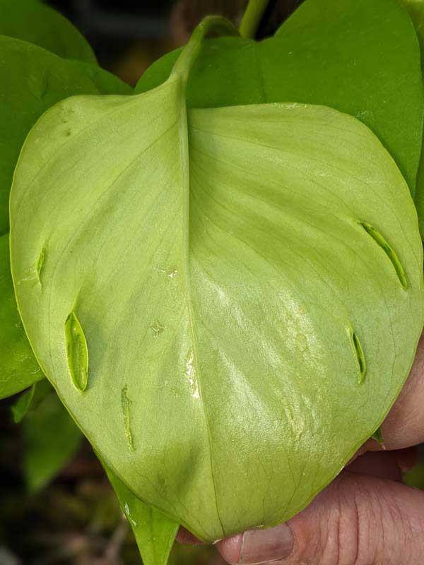 When grown outdoors in warm climates and allowed to climb, this pothos produces leaves up to 10 inches in diameter, often developing an attractive tropical split-leaf form as it matures. Indoors or on the patio, we recommend growing it in a hanging basket so the vines can cascade gracefully, or placing it in a small concrete or heavy pot. A sturdy container helps anchor the plant as it gains size and fullness, keeping it stable as it reaches its full potential.