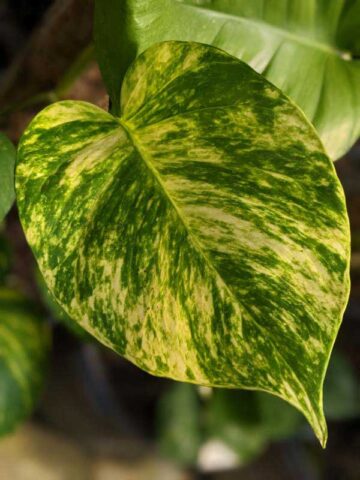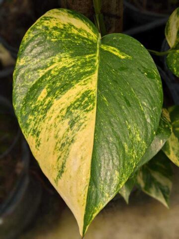 The medium to large foliage grows along long, trailing vines, making this variety perfect for hanging baskets or training up a moss pole or trellis. The distinctive variegation—a vibrant mix of yellow-gold hues against deep green—gives the plant a radiant, high-impact look that stands out in any indoor setting.