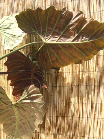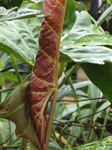Philodendron Corsinianum ‘Giant’ often gives the impression of being self-heading, but it is actually a powerful climbing variety capable of producing enormous foliage. The large, draping leaves carry a brownish-green tone on top with a pinkish-maroon underside, creating rich contrast and depth.