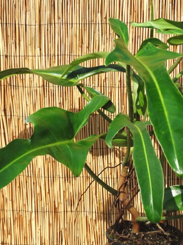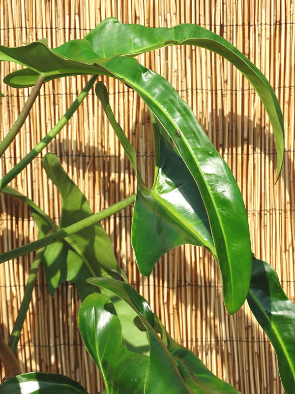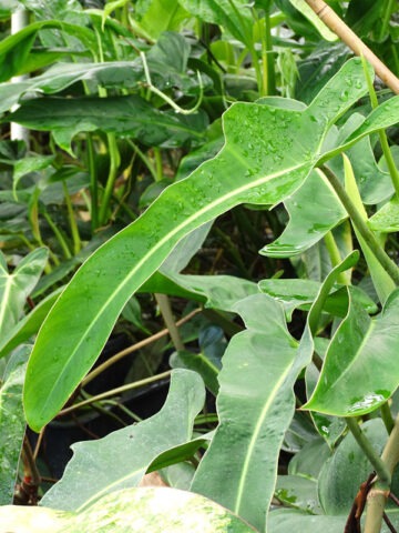 Ecuadorian Canoe Leaf (Jerry Horne) is an impressive climbing philodendron known for its exceptionally long, narrow leaves that curve slightly, resembling a traditional Ecuadorian canoe. The foliage becomes increasingly dramatic as the plant matures, with leaves reaching up to three feet in length. This is one of the larger philodendron types, developing sturdy stems that can approach one inch in diameter when fully established.