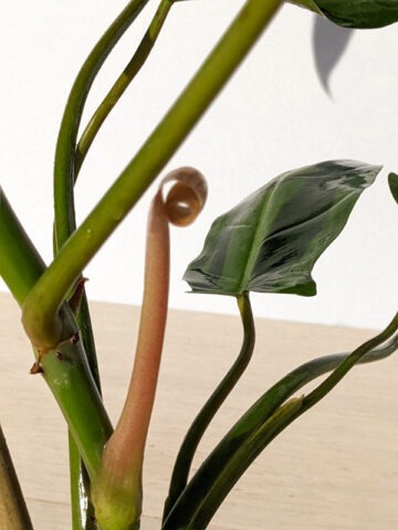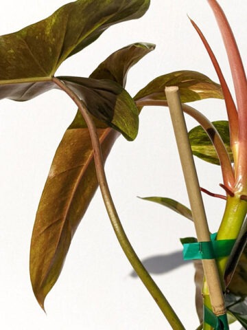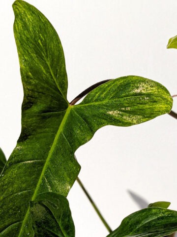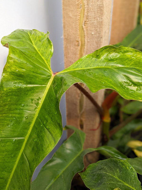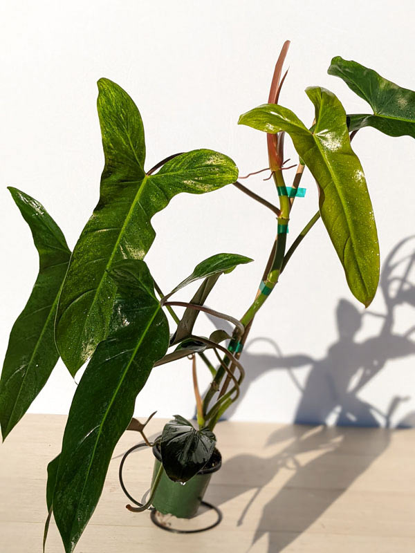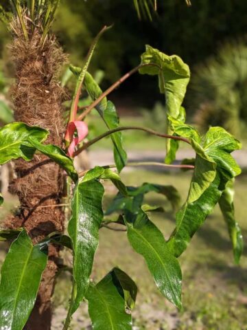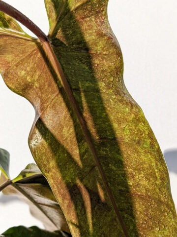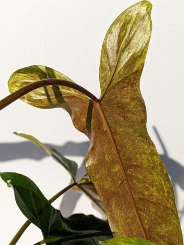 Large Philodendron mexicanum ‘Red Back’ is a bold, fast-growing philodendron known for its long, deeply lobed green leaves with striking red to burgundy undersides. The contrast between the glossy green tops and rich red backs gives the plant strong visual depth, especially as the leaves mature and increase in size. Its dramatic foliage and upright, climbing habit make it an excellent statement plant.