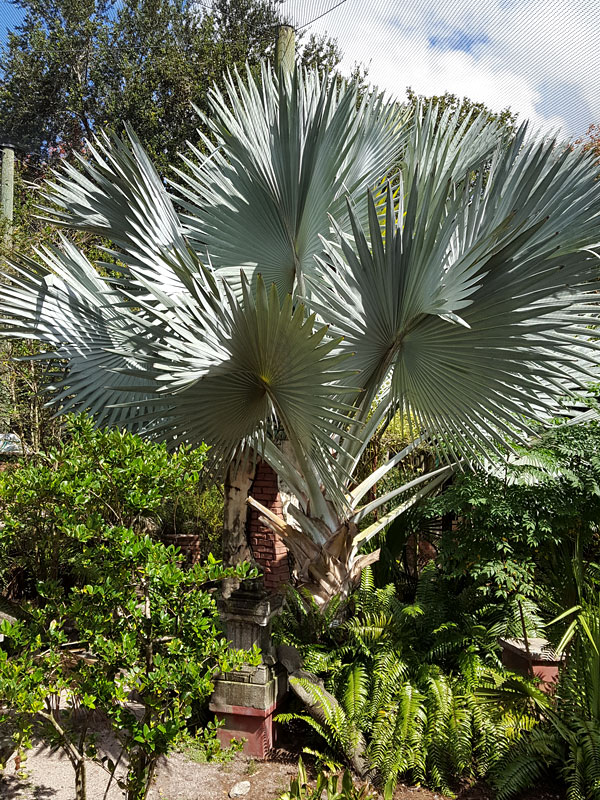 The enormous, fan-shaped leaves can reach up to 10 feet in diameter and glow in a striking silvery blue tone, instantly setting this palm apart in the landscape. Mature trees produce long flower pendants with branching, tentacle-like structures carrying small brownish blossoms.