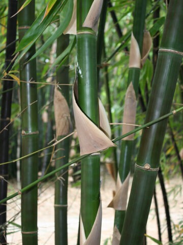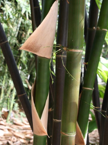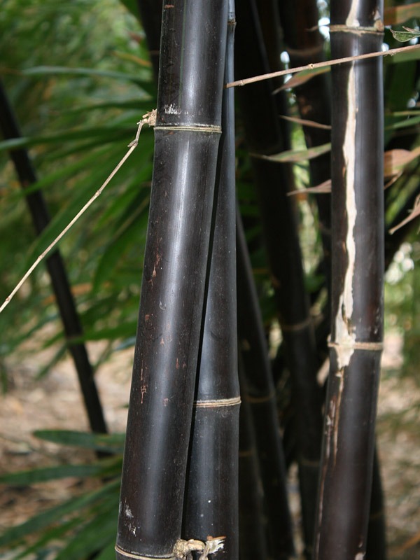 Tropical Black Bamboo, Bambusa lako ‘Timor’, is a striking clumping bamboo known for its dramatic ebony-colored canes. The deep black culms are subtly striped with rich forest green, creating bold contrast and unmistakable visual impact in the landscape.