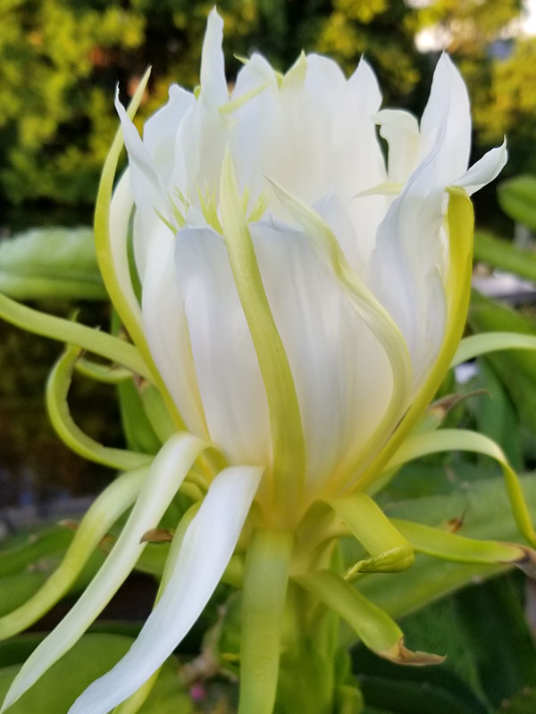 The huge 10-16 inch round flowers are highly fragrant and beautiful in form, usually lasting just one night. Planted in multiples, a mature stand of this trailing Dragon Fruit cactus in full bloom is an unforgettable sight!